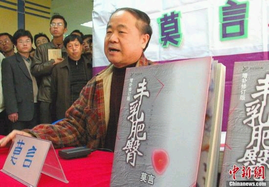 当地时间10月11日,瑞典皇家科学院诺贝尔奖评审委员会宣布中国作家莫言获得2012年诺贝尔文学奖。图为2003年11月15日,著名作家莫言到西安,为其作品《四十一炮》《丰乳肥臀》《良心作证》等作品举行签名售书活动。中新社发李建刚摄图片来源:CNSPHOTO