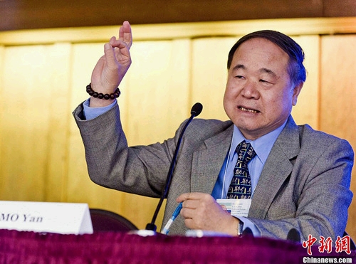 当地时间10月11日,瑞典皇家科学院诺贝尔奖评审委员会宣布中国作家莫言获得2012年诺贝尔文学奖。图为2010年10月16日,中国作家莫言在第二届中美文化论坛上发言。中新社发 陈钢摄