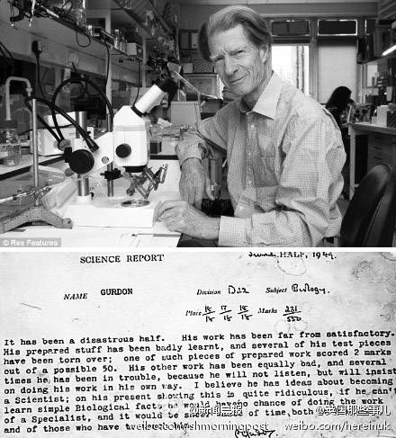 15岁那年,在伊顿公学全年级250名男生中,格登的生物课成绩同样排名最末。63年后的今天,他却被评为全世界最聪明的人之一,与日本科学家山中伸弥共同分享生物学研究的最高荣誉,以及800万瑞典克朗(折合人民币753万元)的奖金。