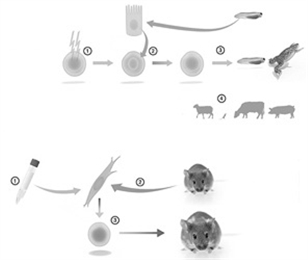 约翰·戈登剔除了一个青蛙卵细胞的细胞核①,用另一只青蛙的成熟小肠细胞核取而代之②,这个被改造的卵细胞发育成一条正常的蝌蚪并长成青蛙③,多年后,细胞核移植研究衍生出克隆动物④。山中伸弥通过载体将四种对细胞分化具有特定功能的基因转入①,实验鼠的皮肤细胞②,诱导这些细胞重新编程,成为多能干细胞③,这些细胞可以定向发育成为成年老鼠的各种体细胞④。