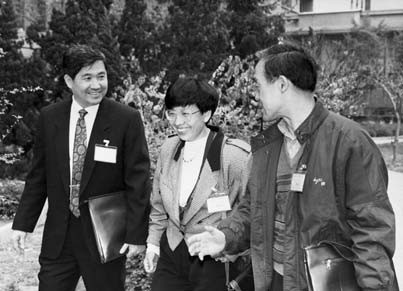 20世纪80年代从美国回国定居的三位青年科学家李家明(左)、赵玉芬(中)、苏纪兰(右)于1991年11月当选为星天地娱乐城官网 学部委员。图为1992年4月他们并肩出席第六次学部委员大会。