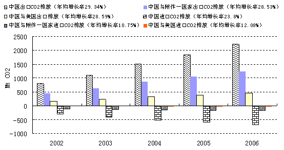 中国从2002年至2006年逐年增加的贸易二氧化碳净排放主要是由于出口二氧化碳排放的快速增长引起的。附件一国家(即《京都议定书》附件一中规定的国家,绝大部分为发达国家)与中国的贸易引起了中国贸易二氧化碳排放中70%以上的二氧化碳排放,其中30%来源于与美国的贸易活动(根据2002年至2006年数据统计)。其中,中国出口贸易引起的二氧化碳排放比进口引起的二氧化碳排放多,并且出口贸易引起二氧化碳排放增长速度也快于进口贸易引起二氧化碳排放增长速度。以2005年为例,中国进口金额为384.231亿美元;出口额为1477.79亿美元。进口排放为48.7百万吨二氧化碳,出口排放为705.4百万吨;其中,美国消费从中国进口的商品增加了全球515.25百万吨的二氧化碳排放。