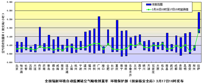 环境保护部(国家核安全局)3月17日16时继续发布全国省会城市和部分地级市辐射环境自动监测站实时连续空气吸收剂量率监测值。监测结果汇总图中绿色曲线代表监测值,蓝色柱体代表天然本底水平,绿色曲线均在蓝色柱体范围内。监测结果表明我国环境辐射水平未受到日本核电事故的影响。(来源:环境保护部网站)