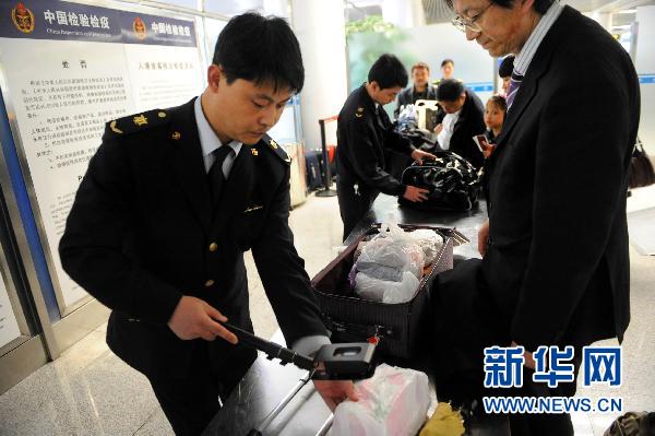 3月16日,检验检疫人员通过便携式核辐射检测仪对从日本东京飞抵青岛的NH927航班旅客行李进行放射性检测。 3月15日开始,针对日本大地震造成的核电站放射性物质泄漏等情况,青岛检验检疫局加强对灾后日本入境航班人员、行李及货物的放射性检测,在机场配备先进的门式、立式和便携式核辐射检测设备,能够在不打扰旅客的情况下,对旅客身体、携带物品和托运行李进行核和辐射检测。 新华社记者 李紫恒 摄