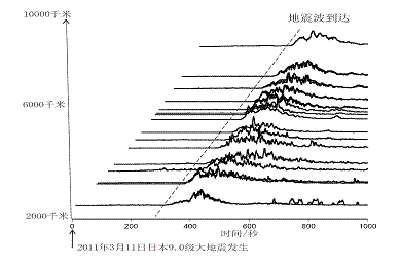 图2.日本大地震在全球地震台网上P波的高频信号显示,该地震持续约120秒。