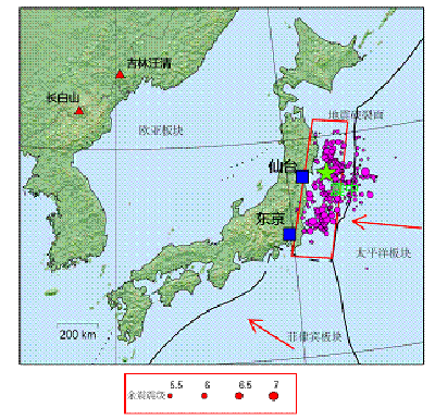 此次地震发生在日本东北部城市仙台以东100多公里的外海中,地震破裂起始点为北纬38.3度,东经142.4度(图1中绿色五角星处)。随后在震中附近发生大量余震,最大余震7.2级,还有5级以上余震数十次(紫色圆点)。地震发生后,多家地震机构给出震级为7.9级,并发布了海啸预警。数小时后,震级修订为8.9级。在分析更多地震数据的基础上,震级又更正为9.0级。