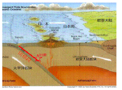 在震源区附近,太平洋板块沿西北方向以每年约10厘米的速度向鄂克霍斯克微板块和欧亚板块运动(我国位于欧亚板块东部,图4)。由于地壳和地幔顶部的温度较低,两个板块平时处于闭锁状态,因此板块间的相对运动导致了强烈形变以及应变能积累。在能量积累到一定程度,板块之间因变形而产生的巨大应力超过板块之间闭锁力的时候,巨大的能量突然释放,形成了此次大地震(图5)。而大地震又伴随着显著的海底形变,直接导致了海啸的产生。此次地震破裂区南端停止于太平洋板块与菲律宾板块的边界(图4),北端终止于日本海沟与千岛海沟的交界处,这两个构造边界确定了日本东北部地震震级的上限,即此处发生的最大地震就是9.0―9.1级,而不像印尼西部那样可以发生破裂长度达上千公里的9.3级地震。