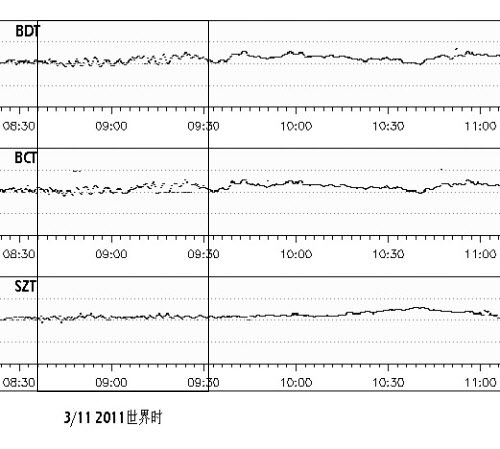 3月11日北京时间13点46分,日本东北部宫城县以东太平洋海域爆发里氏9级地震,在地震发生10分钟后,我国重大科技基础设施项目——东半球空间环境地基综合监测子午链(子午工程)设在北京大学校本部、北京大学昌平园区、北京大学深圳研究生院的电离层高频多普勒接收机监测到了地球电离层中特殊类型的强烈扰动,表现为多种频率组成的次声波波包,在地震爆发约3小时左右,三个台站又陆续观测到了持续时间近一个小时的单一频率(周期3-5分钟左右)的电离层次声波扰动,这种电离层高度上观测到的次声波扰动与地震及随后引起的大海啸造成的大气波动向电离层的传播有直接的关系。