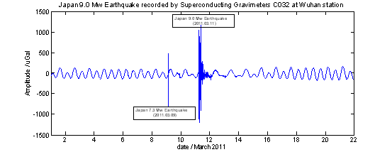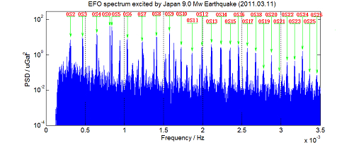 2011年3月11日,在日本东北海域发生的9.0Mw大地震释放出巨大能量,产生严重的海啸灾难,也激发了全球规模的地球自由振荡。测地所武汉大地测量国家野外科学观测研究站超导重力仪C032不仅记录到此次日本9.0级大地震,还检测到它激发的地球自由振荡谱。这些实测地球自由振荡振型可为研究地球深部结构、地球椭率及其自转效应等提供重要约束。