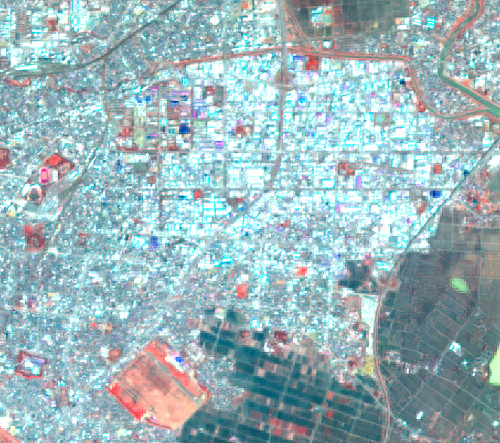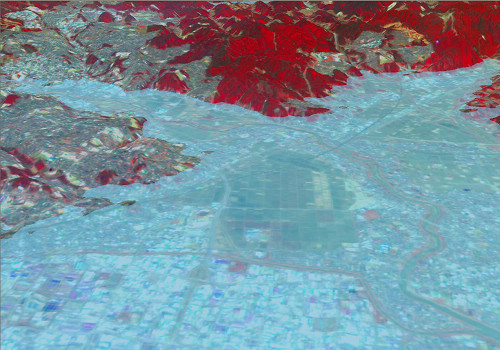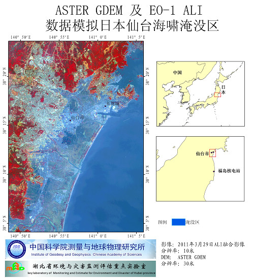 中科院测量与地球物理研究所蔡晓斌博士利用ASTER GDEM及EO-1ALI影像数据模拟了日本仙台海啸淹没区,模拟结果显示模拟出的淹没区内城区一片废墟。分析中所采用的ASTER GDEM是目前全球覆盖分辨率最高的DEM数据,EO-1 ALI数据为日本海啸后2011年3月29日最新获取的影像,影像底图采用影像融合技术将ALI多波段数据分辨率提高至全色的10米。