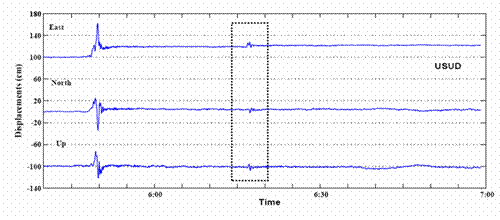日本USUD站的动态位移,从上开始依次为东西,南北和垂直方向,可以看到GPS清楚的记录到了大余震引起的动态位移信息。