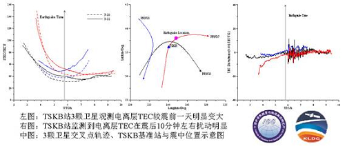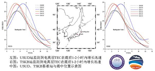 中科院测量与地球物理研究所全球卫星导航系统精密定轨定位研究课题组李子申博士研究生基于自主研发的GNSS电离层数据处理软件,利用TSKB、USUD基准站GPS数据分析了日本9.0级强震前后共7天(3月9日-3月15日)的电离层TEC变化及其扰动。初步分析结果显示:(1)USUD、TSKB基准站上空的电离层TEC在3月11日震前1-2个小时内较背景值(震前2天内电离层平均变化)明显变大(最大约5TECU),震后3天后才逐渐恢复正常;(2)震后10分钟左,TSKB基准站监测结果显示该区域上空电离层TEC发生突然扰动,约1.5小时后恢复至正常水平。上述研究结果为进一步探讨和研究地震与电离层变化之间的关系提供了参考。