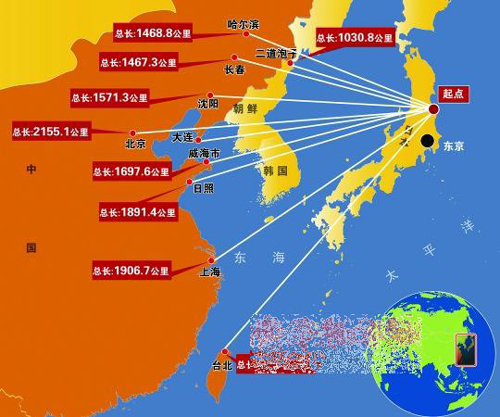 日本核辐射点距离中国各沿海城市距离