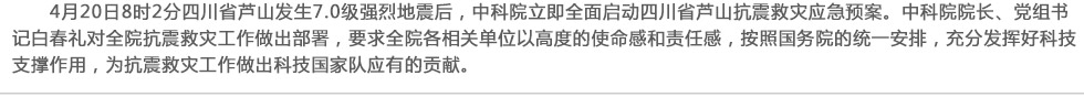 “国家有难,中科院义不容辞。全院各相关单位要以高度的使命感和责任感,按照国务院的统一安排,利用多年的科技积累和综合优势,充分发挥好科技支撑作用,为抗震救灾工作作出科技国家队应有的贡献。” 这是中科院院长、党组书记白春礼在震后第一时间向全院发出的一道号令。中科院各部门及相关科研单位在院领导的指挥调遣下,发挥各自的专业优势,迅速行动起来,投入到紧张有序的抗震救灾工作中。