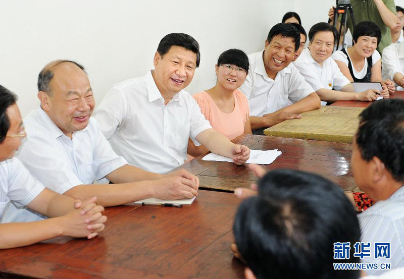7月11日至12日,中共中央总书记、国家主席、中央军委主席习近平在河北省调研指导党的群众路线教育实践活动。这是习近平在正定县塔元庄村社区综合服务中心看望镇村干部和村民。新华社记者李涛摄