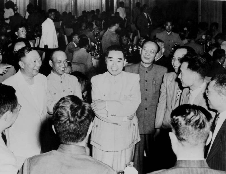 1956年5月26日,周恩来总理在中南海怀仁堂举行十二年科技发展远景规划招待酒会。图为周恩来总理和李富春、聂荣臻副总理、郭沫若院长与参加制定十二年规划的学部委员和科学家亲切交谈。
