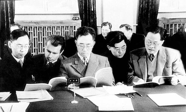 1957年,学部委员、莫斯科杜布纳联合原子核研究所副所长王淦昌(右1)等在工作。