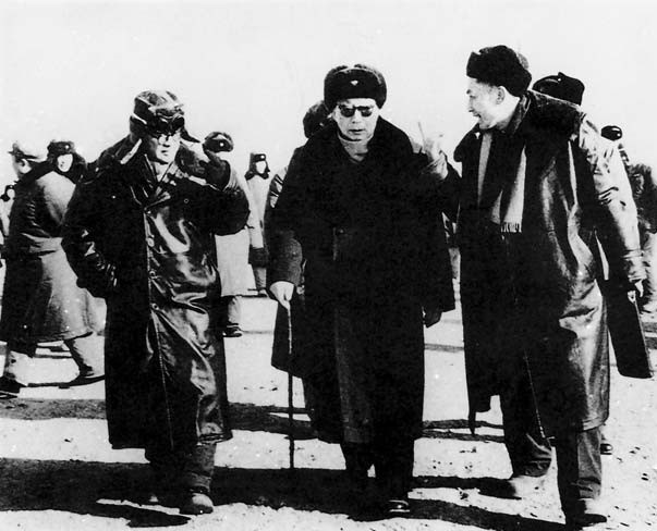 1967年12月,聂荣臻副总理(中)与学部委员王淦昌(左)和朱光亚教授(右)在我国西部核试验基地。