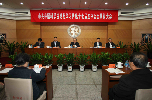 副院长、党组成员詹文龙传达了胡锦涛总书记受中央政治局委托向全会所作工作报告的主要精神;路甬祥传达了温家宝同志就《中共中央关于制订国民经济和社会发展第十二个五年规划的建议(讨论稿)》所作说明的主要内容,传达了胡锦涛总书记在闭幕会的讲话精神,并代表院党组就中科院学习贯彻落实五中全会精神提出了要求。在京的院领导、副部级以上老领导,京区单位党员党政主要负责同志,院机关副局级及以上党员领导干部,院机关离退休党支部书记,京区单位十七大代表出席。