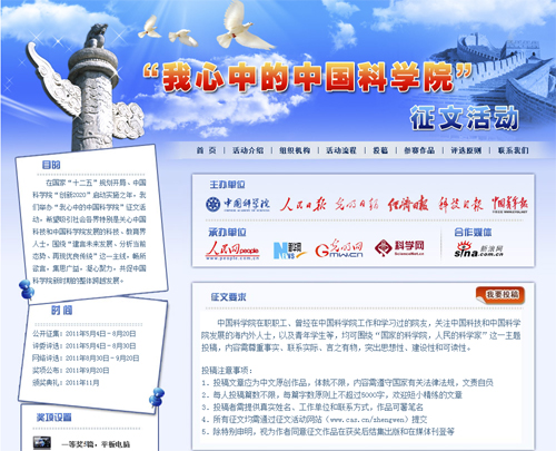 ”征文活动的启动,征文活动网站(www.starstd.com/zhengwen)、活动微博(人民网微博://t.people.com.cn/zhengwen;新华网微博://t.home.news.cn/zhengwen01;新浪网微博://tech.sina.com.cn/cas2011/)、手机平台(15810961109)同时开通。本次活动历时约6个月,参加征文的作品将经过评委会评选、网络评选等环节,评出一等奖5名、二等奖10名、三等奖20名、优秀奖25名,并可能根据实际情况设立特别奖。获三等奖(含)以上的作品将结集出版,并在11月份举行的颁奖典礼上首发。