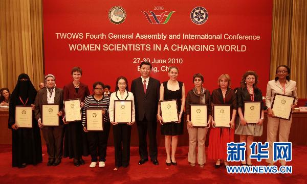 这是在开幕式上,习近平向首届第三世界妇女科学组织女青年科学家奖的获奖者颁奖后合影。新华社记者 庞兴雷 摄
