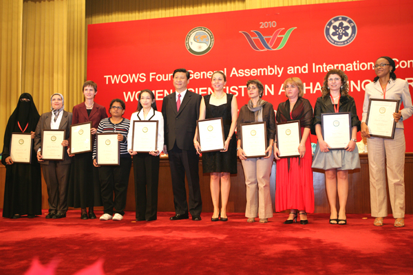在大会开幕式上,国家副主席习近平为12名第三世界妇女科学组织女青年科学家奖获得者颁发了奖牌,该奖项由第三世界妇女科技组织首次设立,旨在奖励45岁以下在物理、化学、生物、数学等领域取得重要进展的发展中国家女青年科学家。