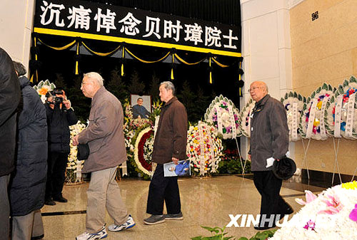 4日上午,八宝山革命公墓东礼堂气氛庄严肃穆。正厅上方悬挂着黑底白字的横幅“沉痛悼念贝时璋院士”,横幅下方是贝时璋的遗像。贝时璋遗体安放在鲜花翠柏丛中,身上覆盖着鲜红的中国共产党党旗。
