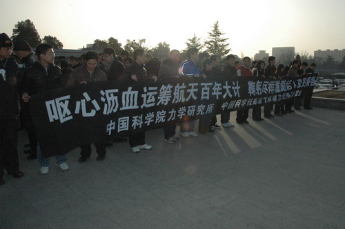追悼会开始前,力学所在队伍一侧拉起横幅,上面写道:“呕心沥血运筹航天百年大计 鞠躬尽瘁激励后人奋发图强”,表达了力学所和中科院高温气体动力学重点实验室对崔尔杰院士逝世的无限哀思和对他一生功绩的深切缅怀。