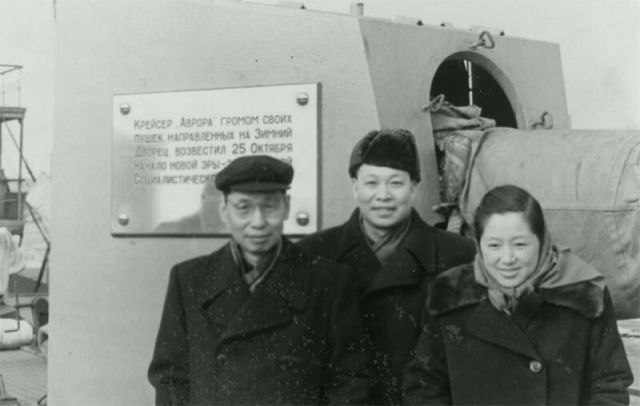 1956年,何泽慧、钱三强、赵忠尧在列宁格勒参观“阿芙乐尔”舰时留影