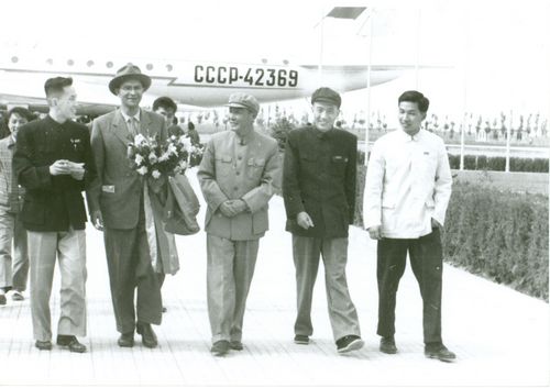 1957年,叶先生到机场迎接苏联电信研究院专家。
