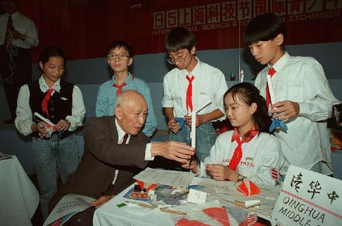 1995年10月20日,朱光亚同志在上海科学会堂观看中学生演示自己动手制作的小火箭模型。