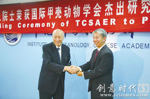 刘瑞玉院士(左)获得国际甲壳动物学会杰出研究贡献奖