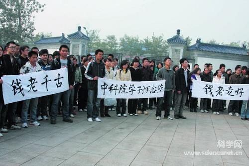 中科院研究生院数百名师生也前往参加送别仪式。“中科院学子怀念您”、“钱老千古”、“钱老走好”,这些研究生自发打出的横幅,表达着年轻学子对一代科学巨星的尊敬和怀念之情。