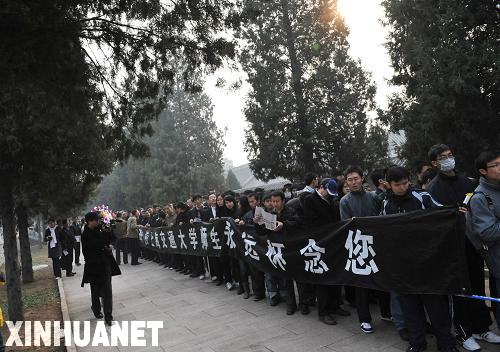 11月6日,来自上海交通大学的师生们打着横幅排队,准备向钱学森同志遗体告别。当日,钱学森同志遗体在北京八宝山革命公墓火化。新华社记者 何俊昌 摄