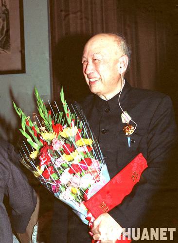 1991年10月16日,80岁的钱学森同志在国务院、中央军委举行的授予他“国家杰出贡献科学家”荣誉称号仪式上。  新华社发