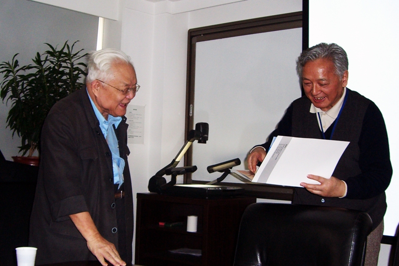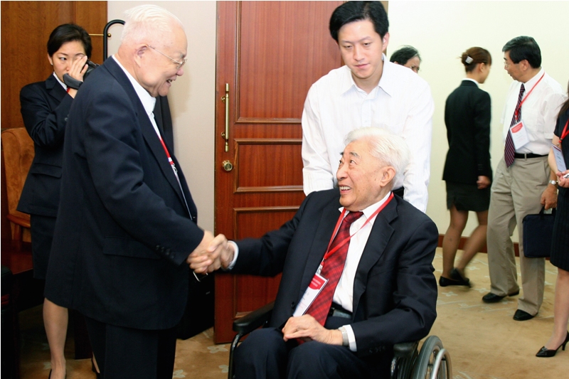 2006年,吴文俊获邵逸夫数学科学奖,丁石孙向吴文俊祝贺