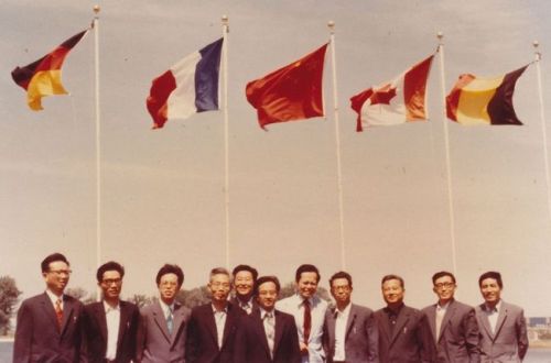 1978年,高能加速器设计考察组在FNAL升起中国国旗后合影留念,谢家麟(右四)